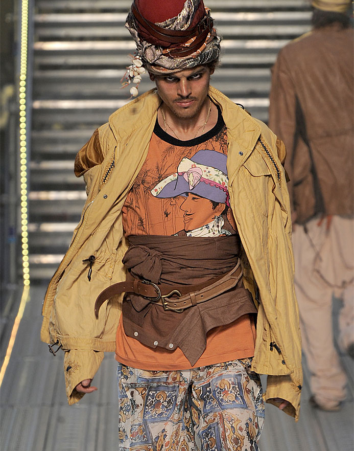 Black silk shiort reworked kimono green and yellow overstitched paper coat black wool draped trouser.